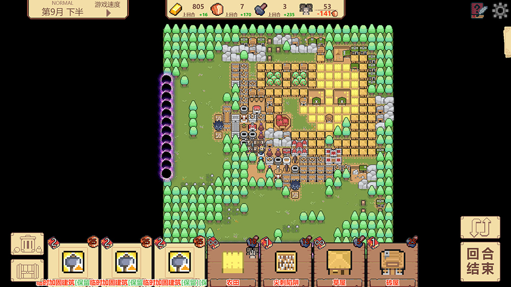 A:游戏整体分为两个部分:正常流程和无尽模式。因为是独立开发,精力比较有限,所以我把主要精力都集中在了正常流程部分的打磨上。得益于是回合制的结构,玩家每回合能获取多少资源,其实是可以预估的——这也让我们相对容易地估算出玩家在平均水平下的战斗力上限,进而安排对应的敌人强度。为了控制玩家的成长节奏,我重点做了人口上限和食物消耗这两个机制。人口上限要求玩家在前期做好战斗力和基础发展之间的平衡;而食物消耗机制则起到了“刹车”的作用,防止玩家无限制扩张,头上始终悬着“被饿死”的那把大刀。这两者共同制约下,玩家的成长节奏始终处在一个相对可控的区间。