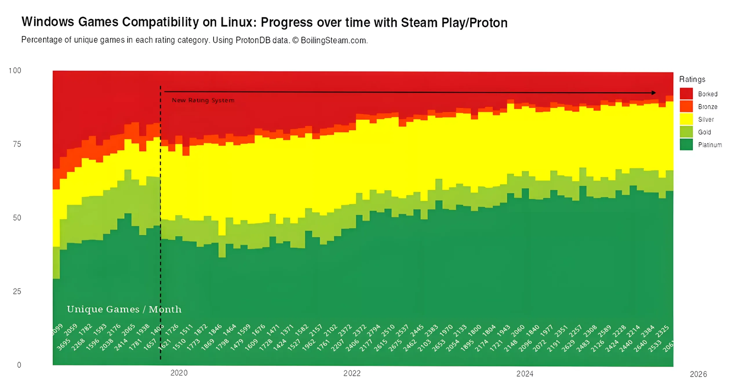 随着Steam Deck的普及,越来越多玩家直接体验到Linux系统的可玩性。社区网站ProtonDB的用户反馈显示,获得“铂金”和“黄金”评级的游戏数量持续增加,意味着大部分主流游戏在Linux上几乎无需额外调整即可运行。与此同时,完全无法运行的游戏比例已降至约一成,主要集中在依赖特定防作弊系统或厂商限制的作品。