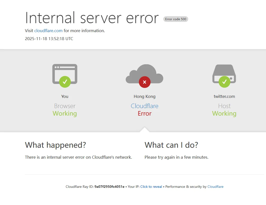 北京时间11月18日晚间19点起,全球知名服务器托管商Cloudflare出现大规模异常。大量依赖其服务的网站和应用在短时间内无法正常访问,用户普遍遇到“Internal Server Error 500”提示。此次事件波及范围广泛,涉及社交平台、游戏服务以及部分科技媒体站点。