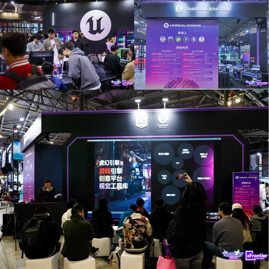 虚幻引擎的展区现场提供了十多款以虚幻引擎开发的游戏作品体验两天安排了各种演讲活动,提供技术方面的信息与交流。