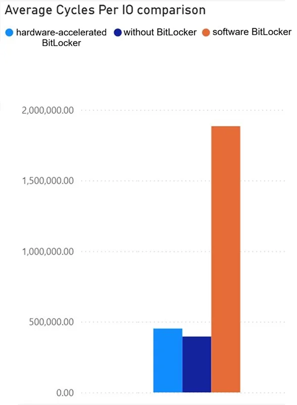 BitLocker一直保持较低的CPU占用,但随着I/O速度的提升,软件加密难以匹配硬件传输效率。新版本采用XTS-AES-256算法,并将加密运算交由SoC内置的专用AES引擎处理。这样不仅释放了CPU资源,还提升了整体性能和设备续航。